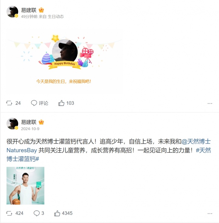 10月27日訊 易建聯個人社媒今日更新了一則生日動態。這是易建聯個人微博社媒關于生日的自動動態。