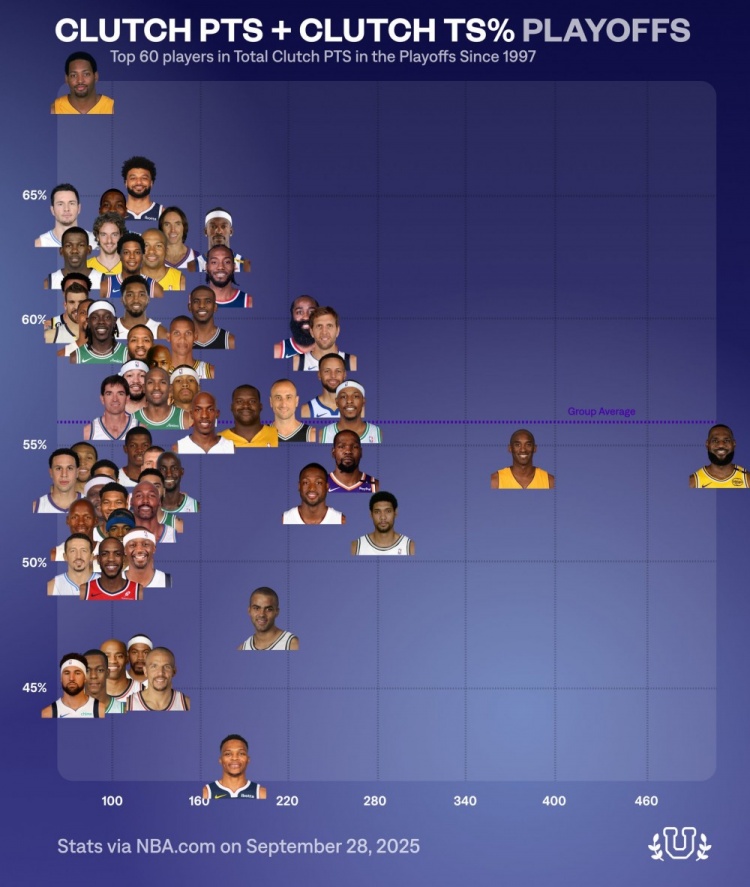 9月29日訊 近日,數據媒體NBA University總結了自從1997年以來(NBA官網該項數據統計起始時間)在NBA季后賽中關鍵得分前60球員的真實命中率分布圖表。