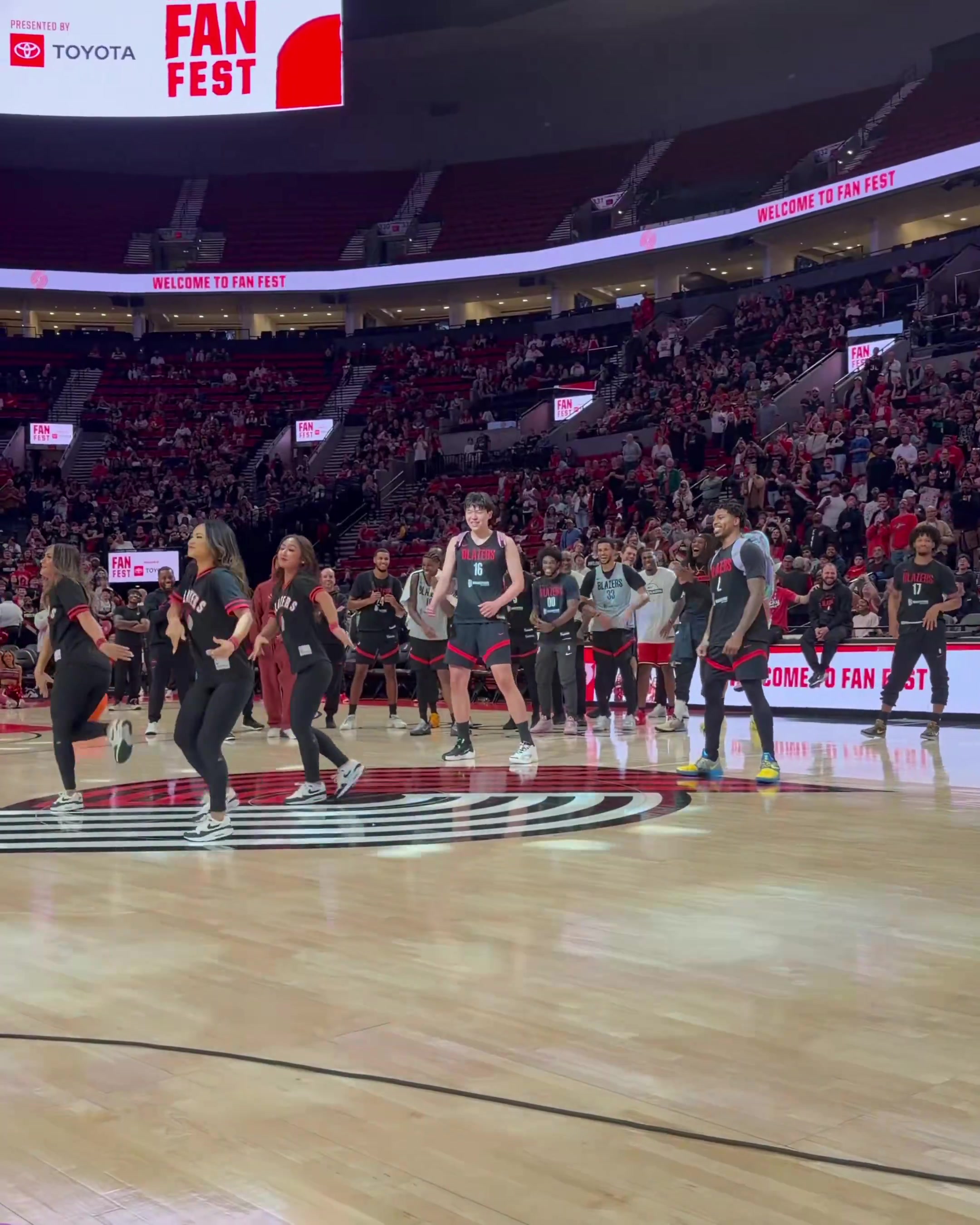 10月5日訊 在開拓者球迷嘉年華上,新秀楊瀚森和凱萊布-樂福背著書包跟啦啦隊(duì)學(xué)跳舞。