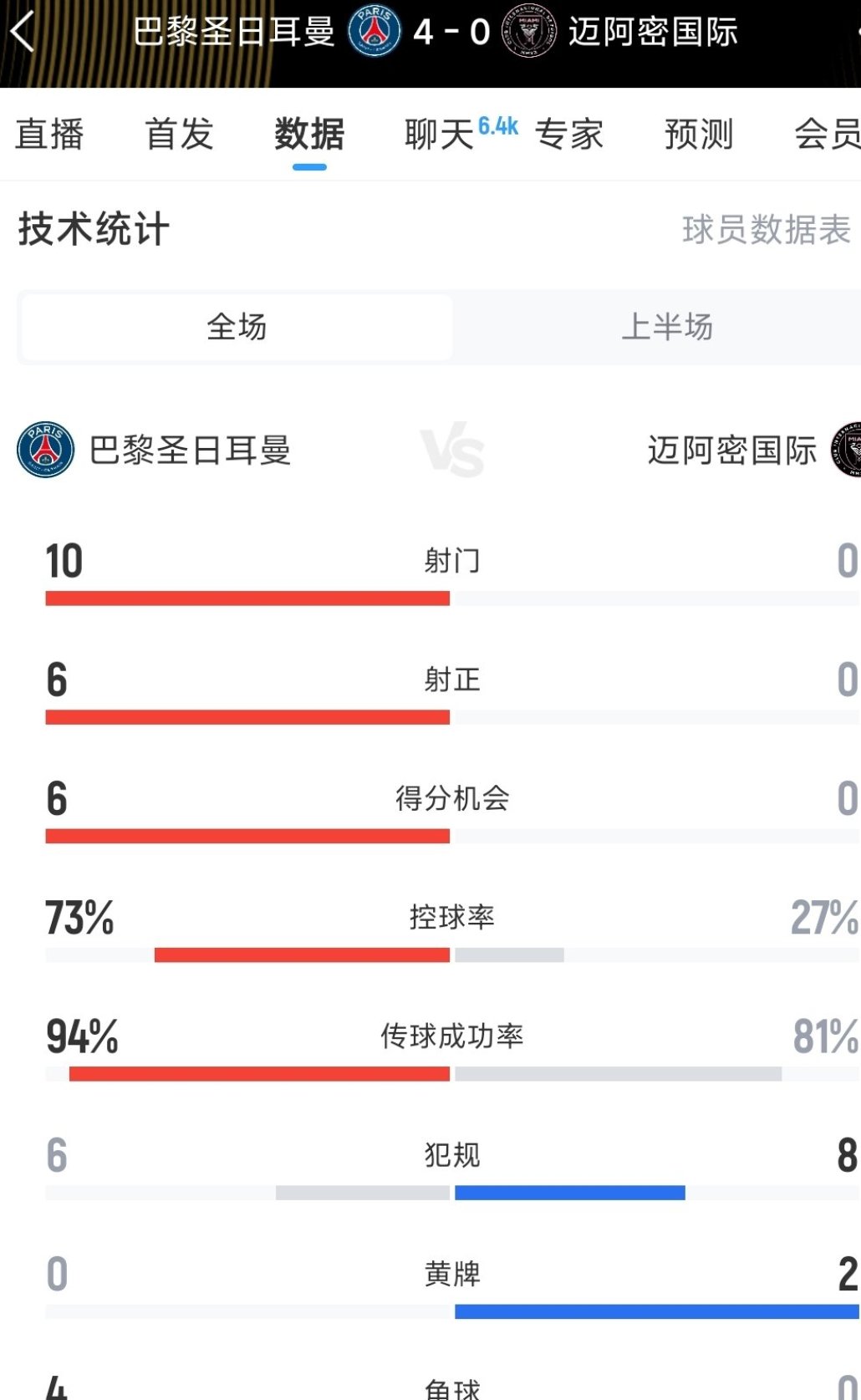 巴黎圣日耳曼vs邁阿密國際半場數據: