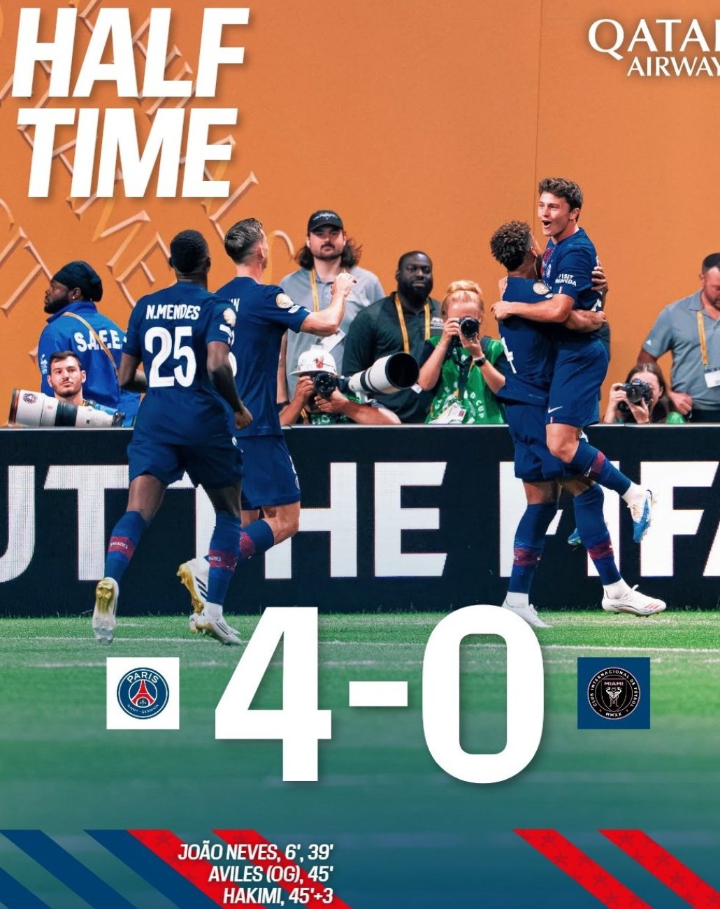 06月30日訊 世俱杯1/8決賽,巴黎圣日耳曼vs邁阿密國際。上半場比賽結束,巴黎4-0領先邁阿密。半場數據如圖所示。