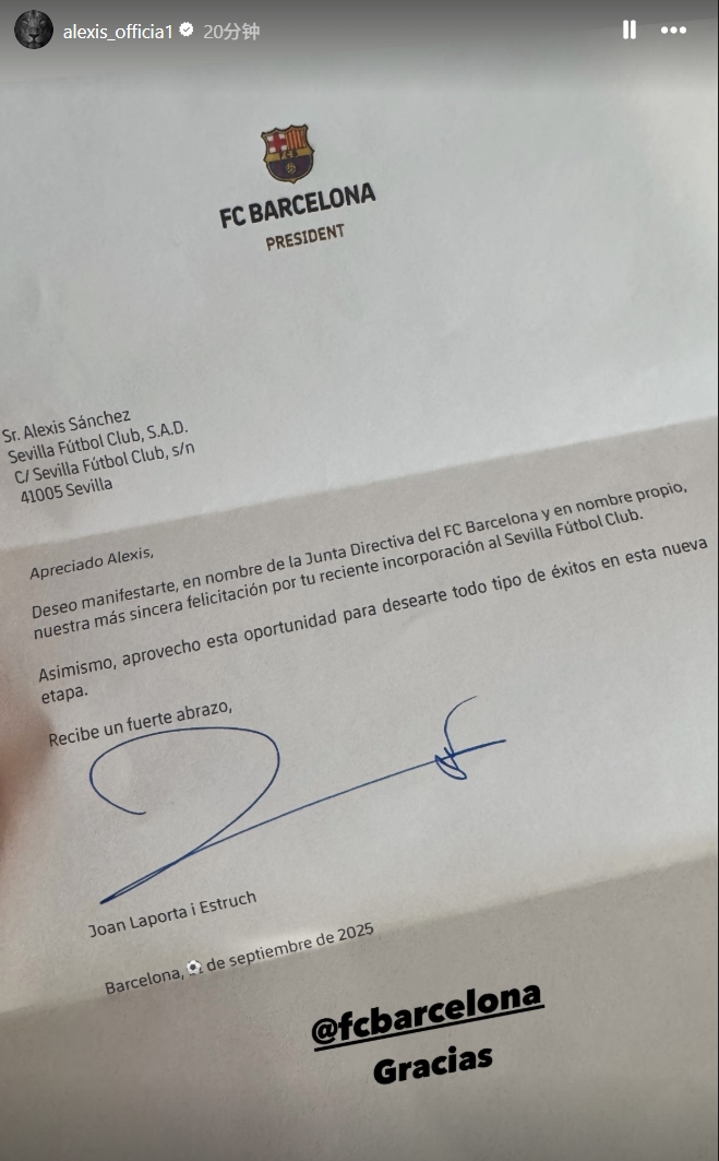 09月23日訊 36歲的智利前鋒、巴薩舊將桑切斯今夏回歸西甲加盟塞維利亞。今天他更新社媒,展示了一封老東家巴薩發來的賀信。信中大致寫道: