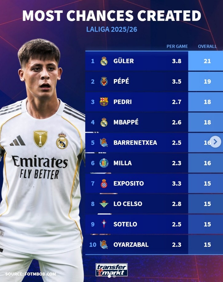 9月30日訊 德轉盤點了本賽季西甲創造機會榜單,其中居勒爾共計21次創造機會居首,具體如下(場均數據+總數據):