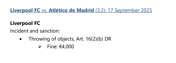 10月01日訊 歐冠首輪比賽,利物浦3-2戰勝馬競。本場比賽中,利物浦因為球迷投擲物品,違反《歐足聯紀律準則》第16(2)(b)條,俱樂部被罰款4000歐元。