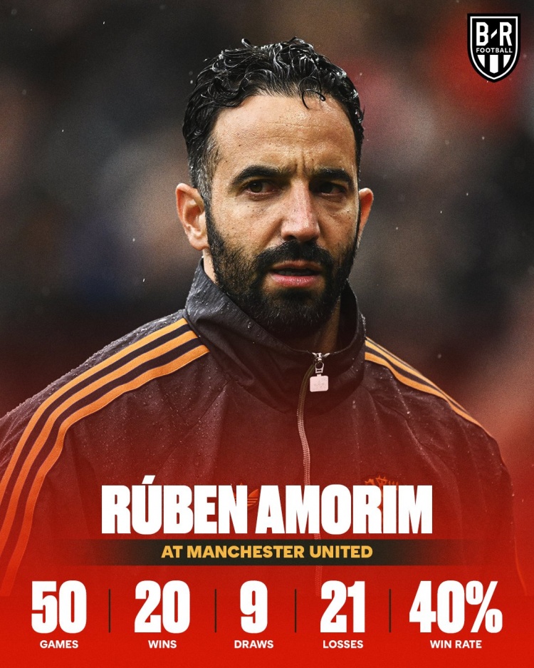 美媒B/R Football曬出海報(bào),海報(bào)中羅列出阿莫林執(zhí)教曼聯(lián)以來的戰(zhàn)績:50場比賽,20勝9平21負(fù),勝率40%。