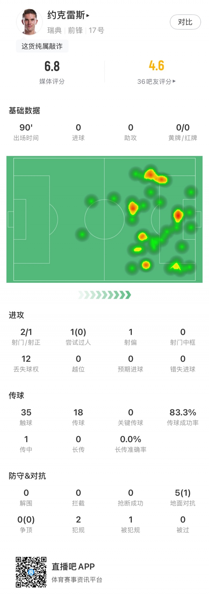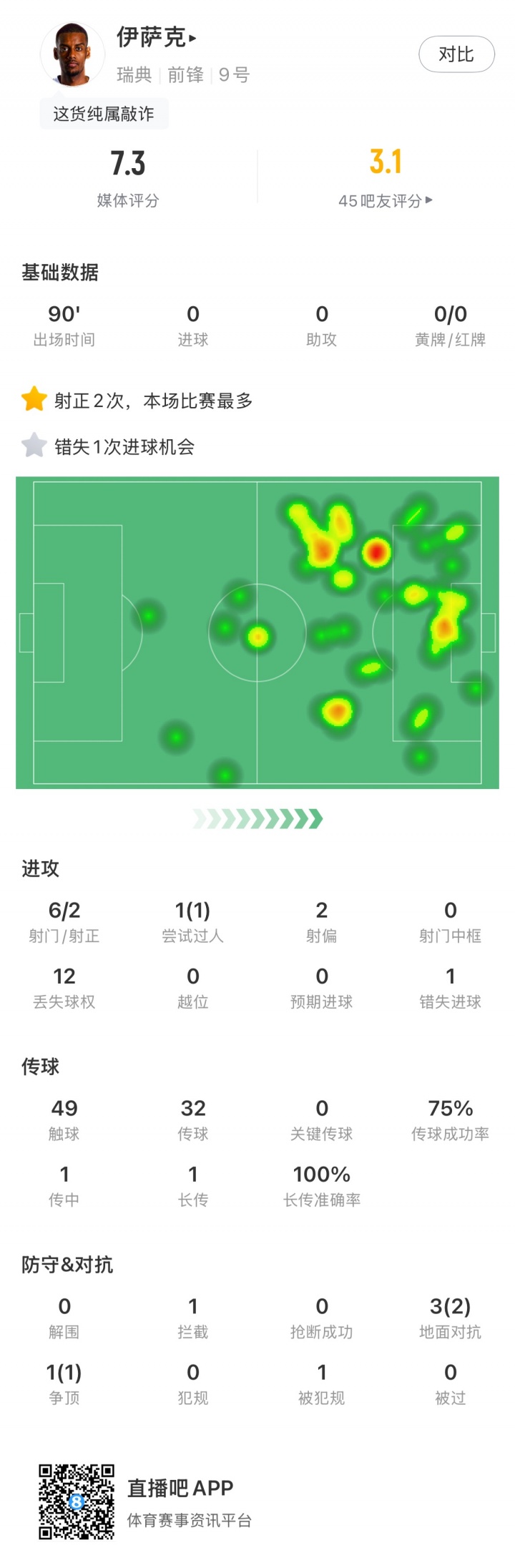 本場約克雷斯、伊薩克均首發打滿全場,伊薩克全場6射2正0球,1次錯失良機。約克雷斯數據為2射1正0球。