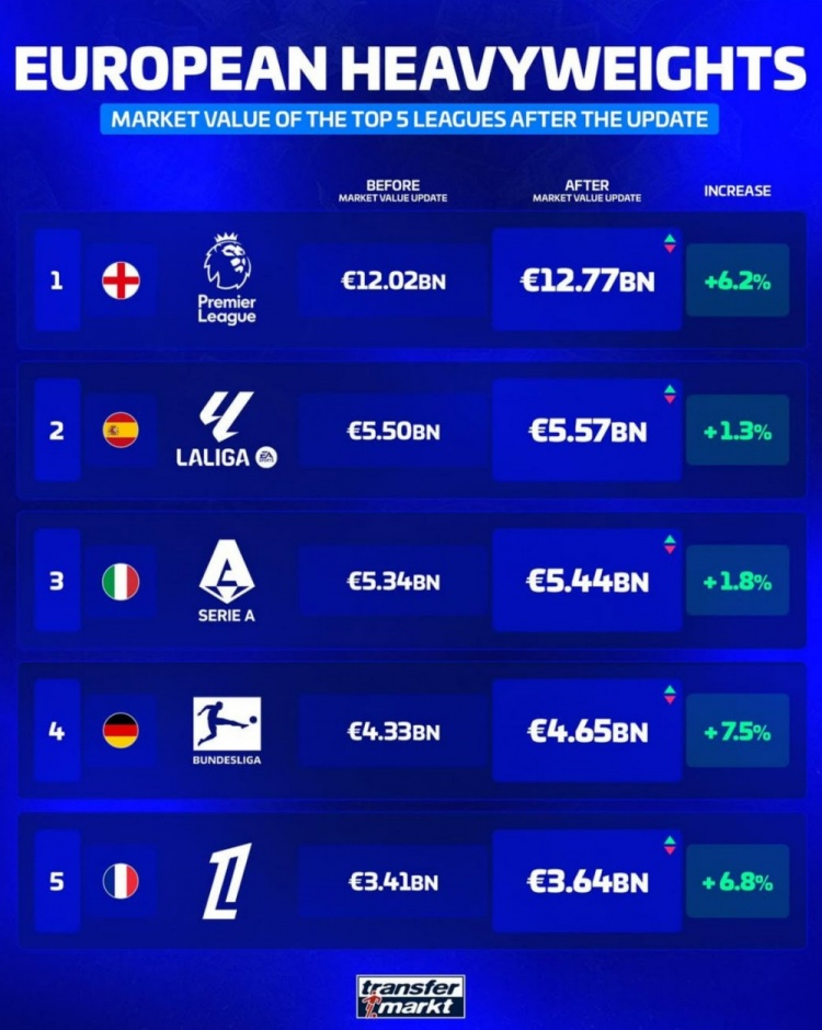 10月20日訊 德轉此前更新了足壇球員身價,并盤點了五大聯賽球隊總身價榜,其中英超遙遙領先,以下為具體情況: