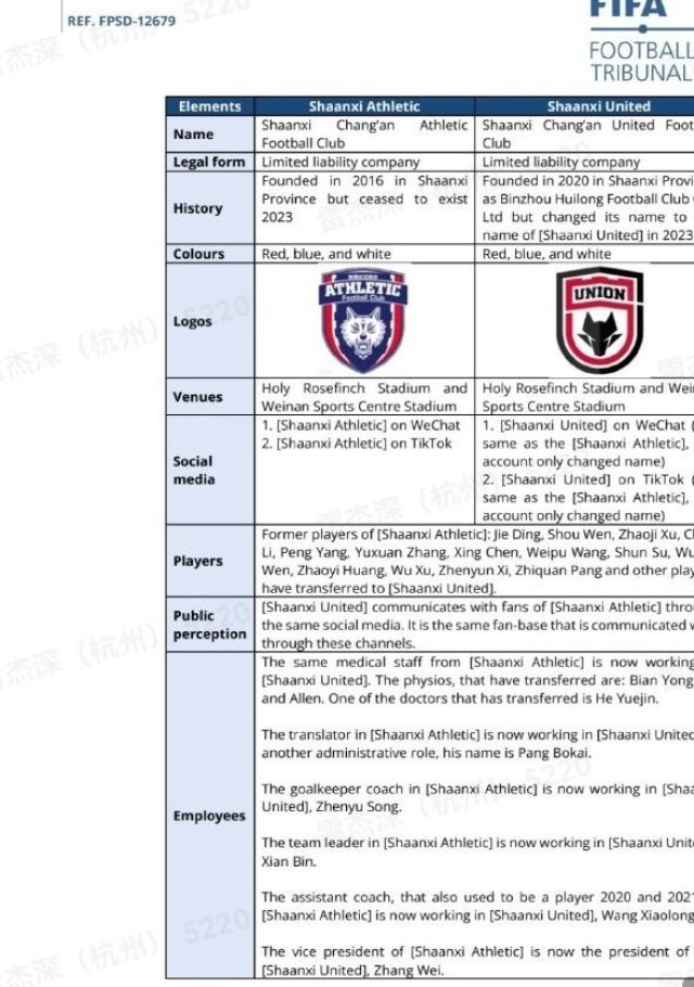 陜西聯合在應對訴訟時提出:俱樂部2020年就已經成立,并非是2023年才成立;前身是彬州輝龍,與長安競技也不是同一個法人實體。兩家俱樂部隊徽完全不同,長安競技俱樂部也從未使用過“聯合”的名字;使用原長安競技的球員,僅僅是出于競技層面的需要。而且長安競技尚未破產,球員仍可對其起訴,而不是來起訴陜西聯合。