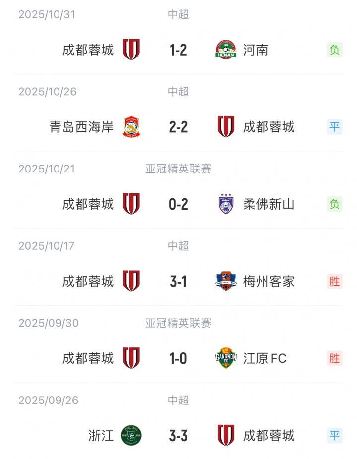 【蓉城近期戰績】