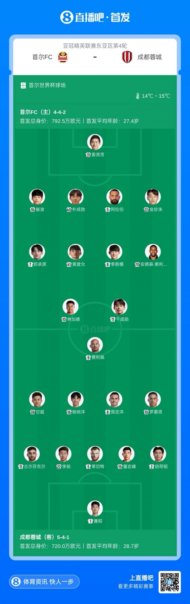蓉城客戰首爾FC首發:費利佩、胡荷韜、周定洋先發,林加德出戰